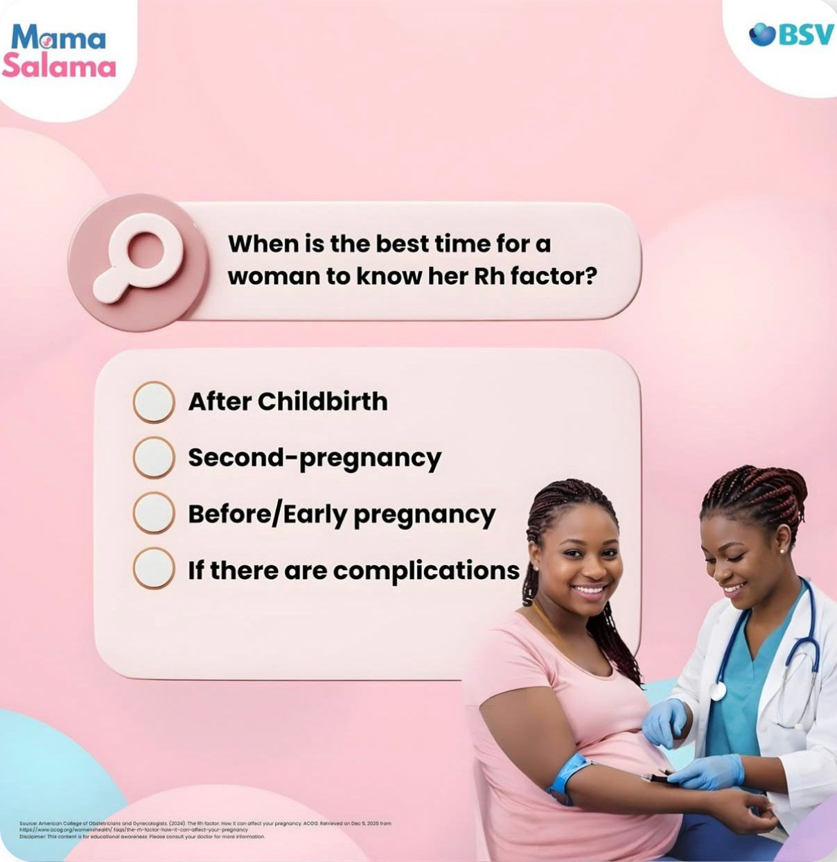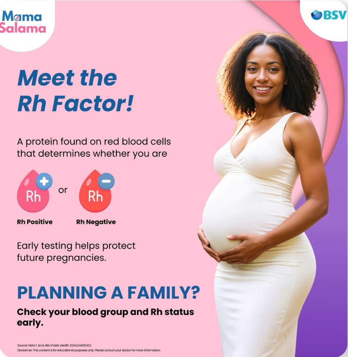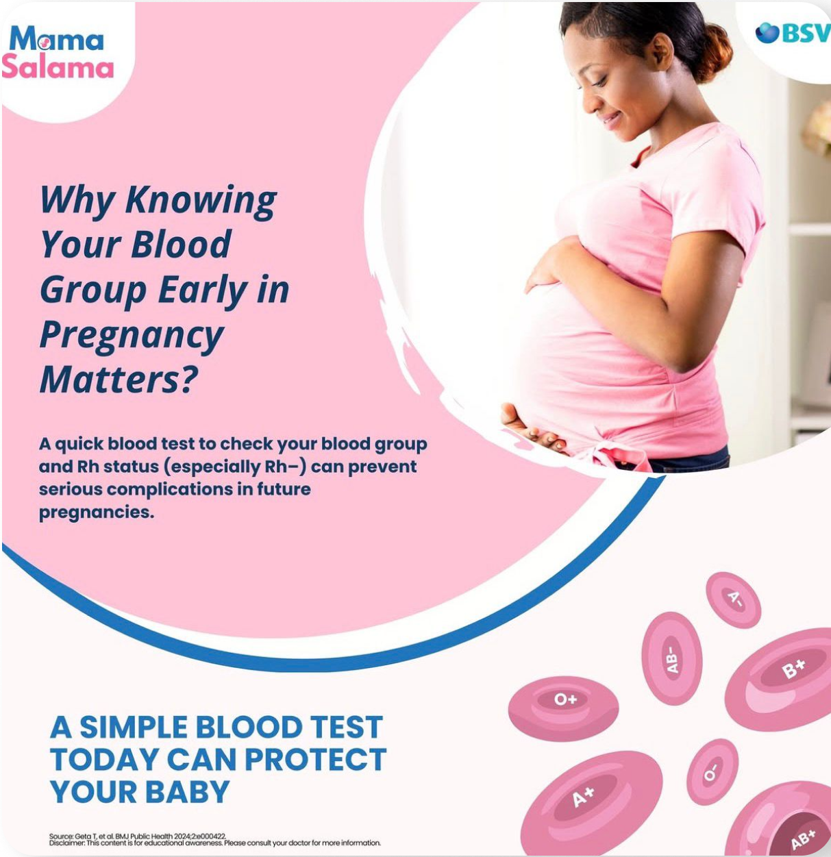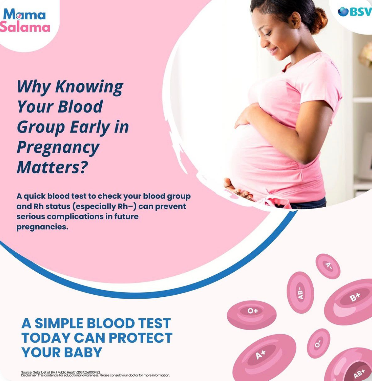 Awareness is the first step toward prevention. Many complications related to blood groups and Rh incompatibility can be avoided simply by providing the right information at the right time. Mama Salama gives mothers, families, and communities access to simple, trusted, and easy-to-share information about blood groups, the Rhesus (Rh) factor, and safe pregnancy care.
